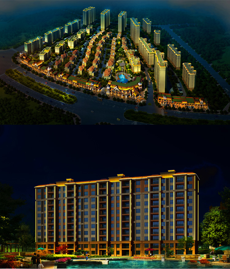 碧桂園小區(qū)建筑泛光照明,建筑輪廓照明和局部重點照明進行建筑環(huán)境景觀的在塑造,設(shè)計中舍棄了景觀中繁瑣細節(jié)的表現(xiàn),將較直觀的景觀以大氣的燈光渲染出來,營造大氣的燈光氛圍,以節(jié)能而質(zhì)樸的燈光為市民營造一個優(yōu)美高雅的夜間環(huán)境,為韓城夜色添了一道亮麗風景。打造出綠色的主題思想。