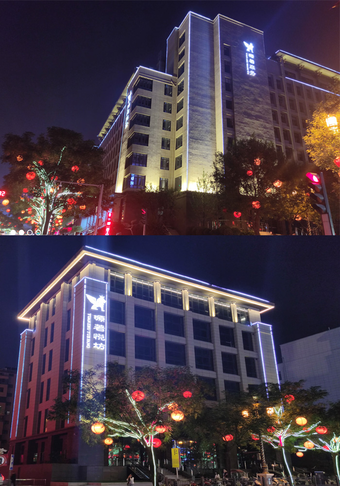 簡介—— 陜西西安曲江源著項目位于西安市雁塔區,比鄰大雁塔,是公寓住在,周邊配套完善。該項目是我是2021年9月開始施工的項目,主要是對公寓樓做線條勾勒,將建筑的主體效果體現出來,樓頂采用的是線條勾勒以及頂部打亮,整體體現出簡潔大氣的夜景亮化效果。